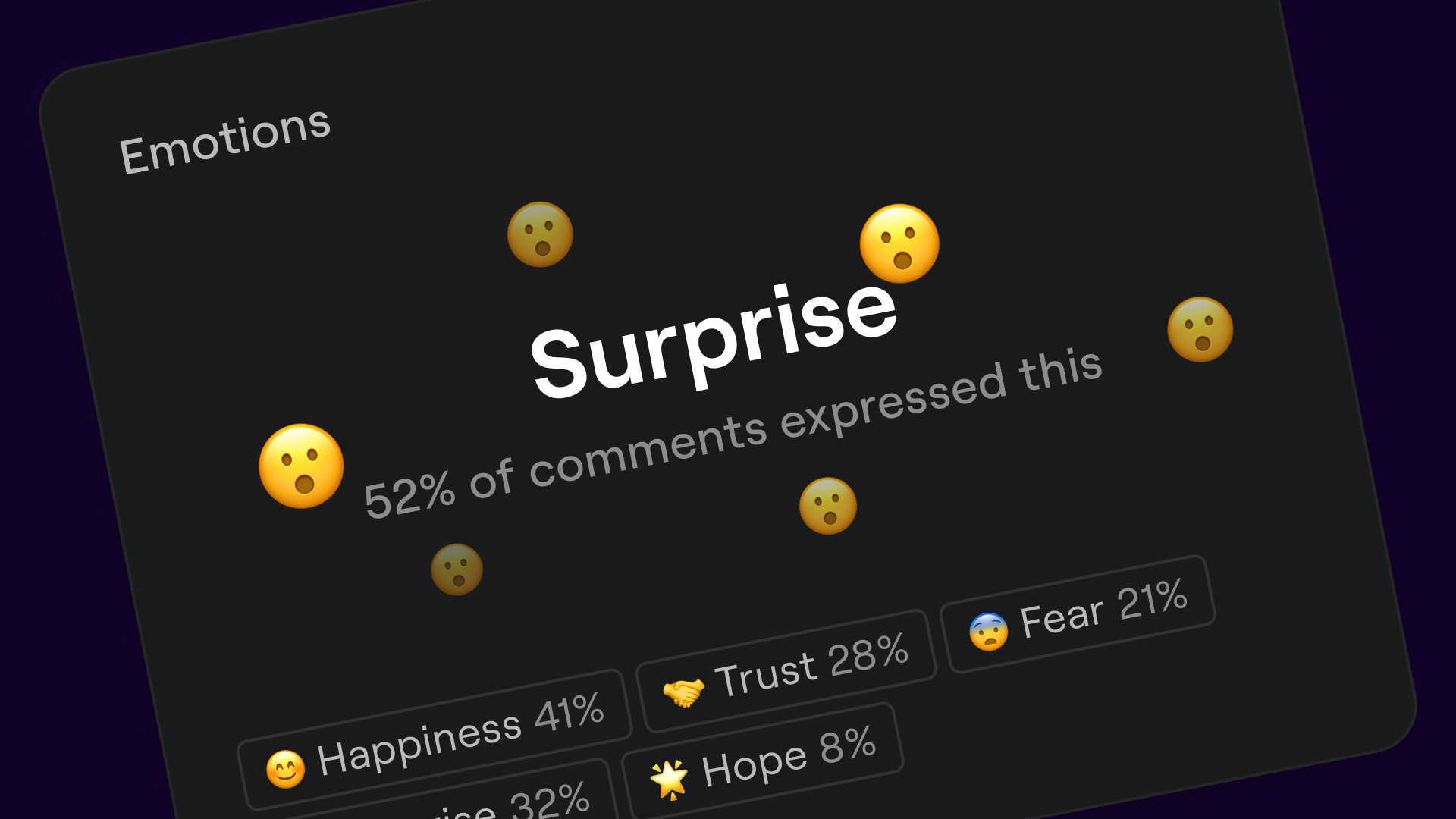 This card shows you which emotions were detected in the video's comments. Soon, you'll be able to filter on them to drill into any emotion and see the related comments.
