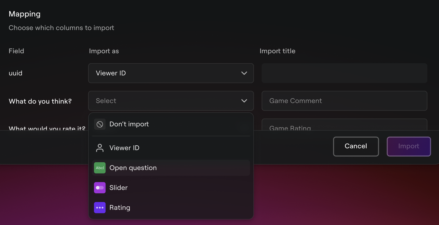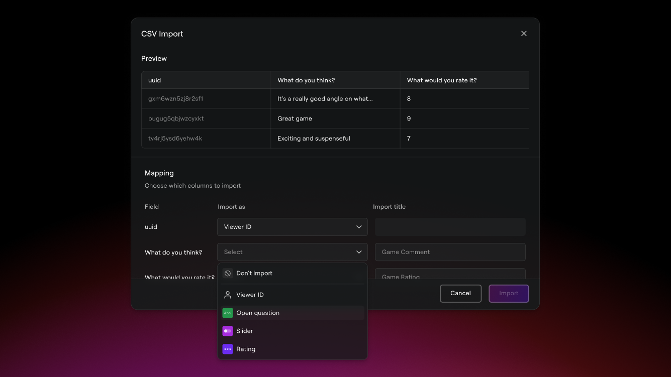 You can even import viewer data and questions from the same file at the same time. Just map your fields as needed and Lumiere will do the rest!